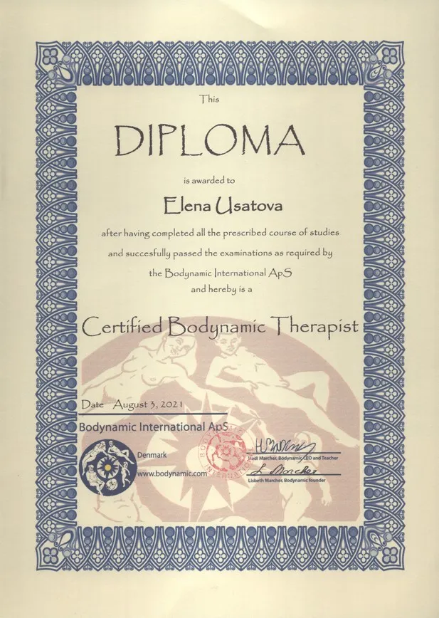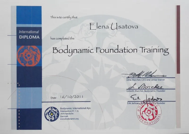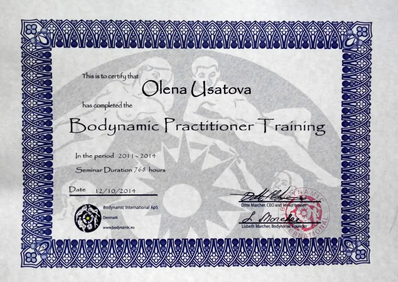 Усатова Олена – сертифікований бодінаміст – практик. Пройшла навчання I та II ступенів за програмою Данського Інституту Бодинаміки http://www.bodynamic.dk/